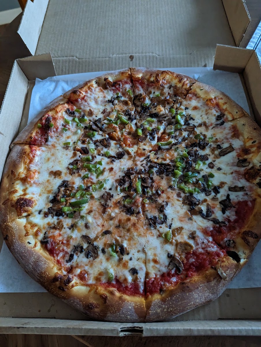 It was spacious and our table was clean. We got a large pie, half cheese half mushroom and pepperoni. It was excellent. I requested light cheese on the cheese portion and they did a good job. On the toppings side, the mushrooms were sliced thinly and toppings evenly distributed. Overall pleased with our decision to try them out and we look forward to returning and trying some of the other items on the menu.